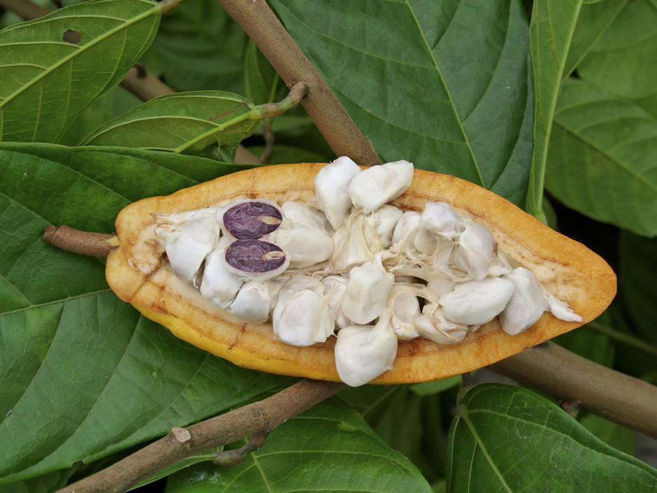 Les fruits ouverts, et les fèves de cacao. A cet état elles ne sont pas mangeables. Il faut les faire sécher au soleil pour obtenir des fèves de cacao. Que l’on utilisera pour faire du chocolat. Et plus tard (obsession oblige !) de la Mousse au Chocolat !